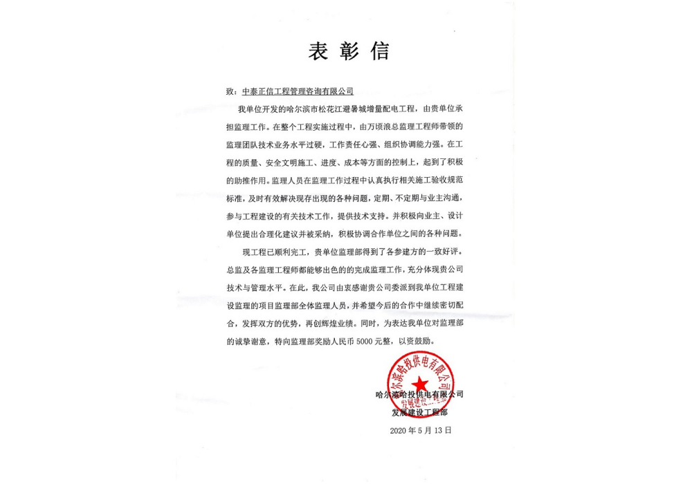 2020年哈爾濱市松花江避暑城增量配電工程表彰信